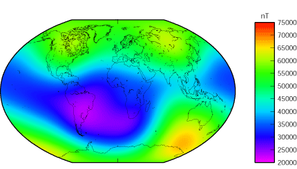 外核起源の磁場の形は地球の中心に南北方向の棒磁石をおいた場合と似ていますが、その棒磁石の強さが少なくとも最近200年間減少を続けています。この変化は何万年以上にもわたって繰り返されている増減のほんの一部を見ているにすぎず、このまま地磁気がなくなってしまうわけではないと考えられます。