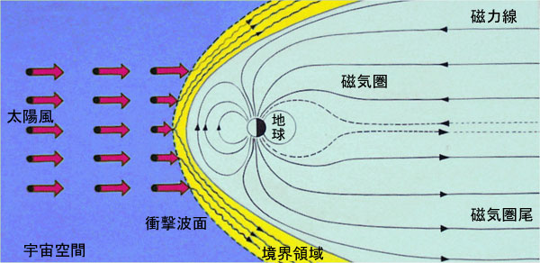 (地球の磁気圏は、太陽風のため昼側では地球半径の10倍ぐらいに圧縮され、夜側では細長い尾を引いています。)